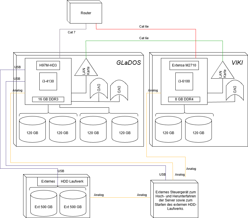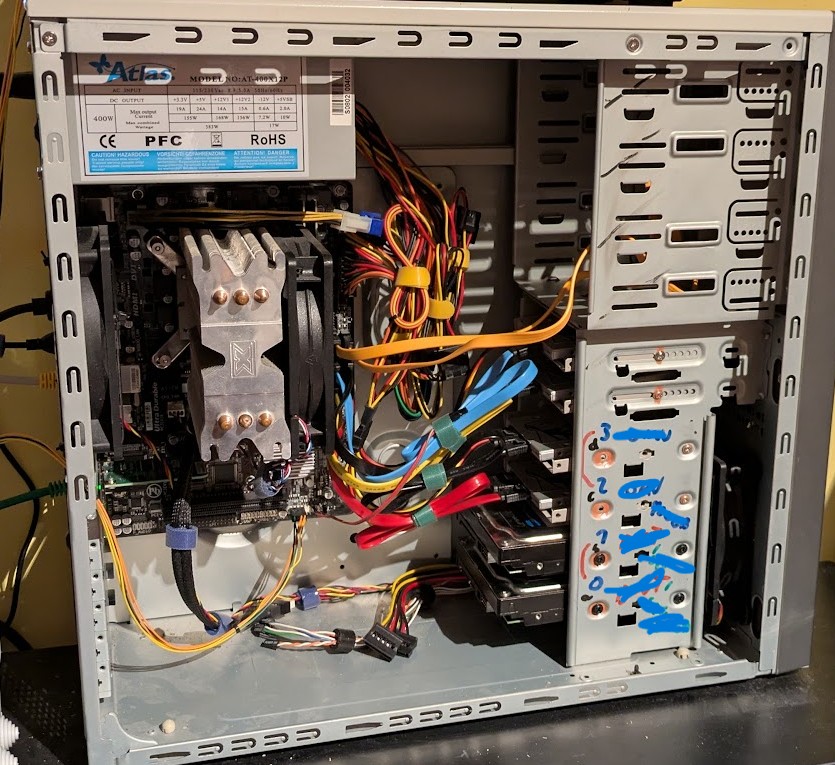Mainbord: H97M-HD3 CPU: i3-4130T RAM: 2X 8GiB DIMM DDR3 1600 MHz Festplatten: 4X 120GB KINGSTON SUV400S SSD (Intern) 2X 500GB WD HDD (Extern) Zusatz: TP-Link TG-3468 (Zusätzliche Netzwerkarte) 2X DVD Laufwerk